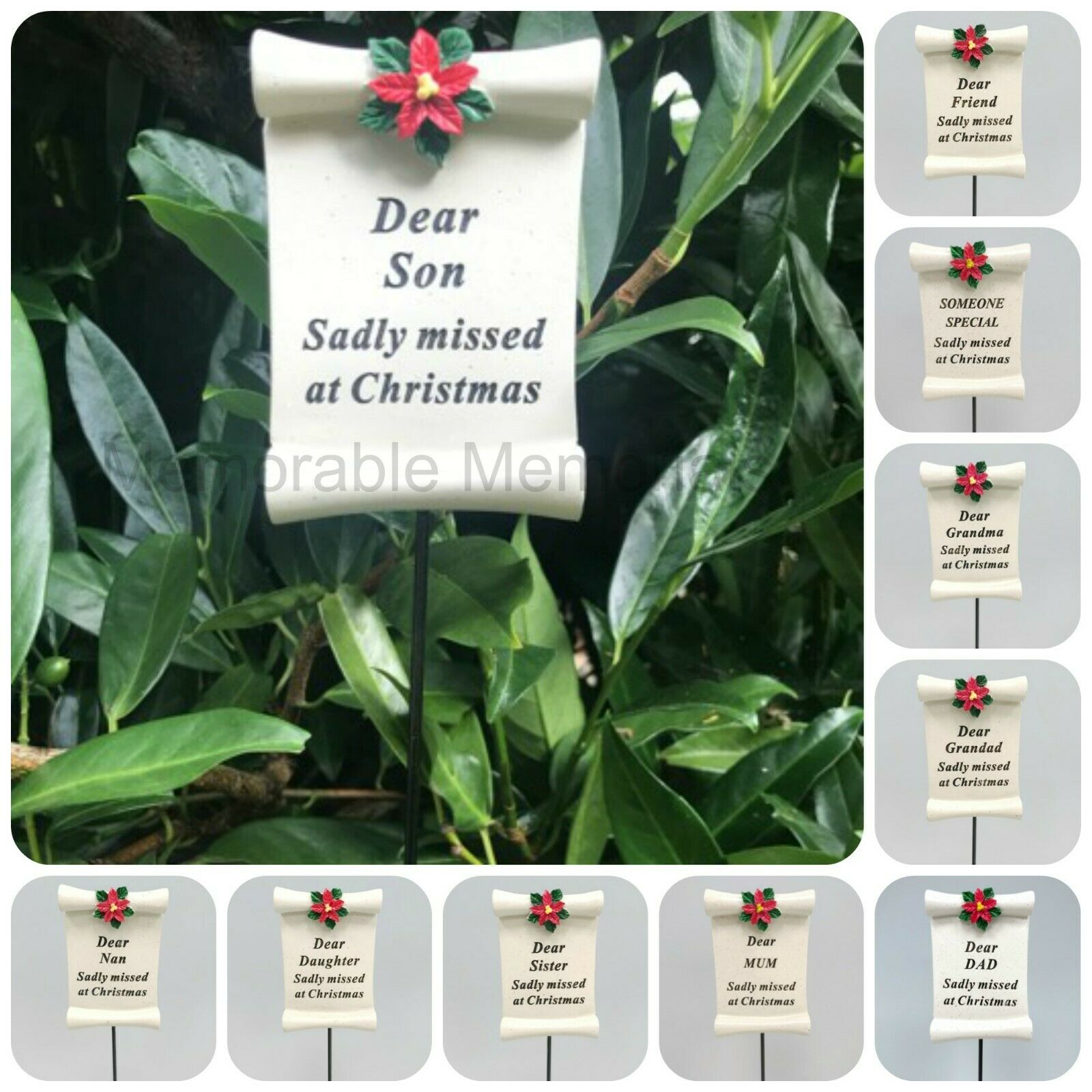 - A beautiful and tasteful graveside tribute in the shape of a scroll with a poinsettia flower detail.