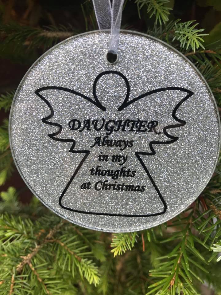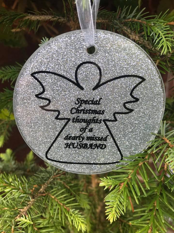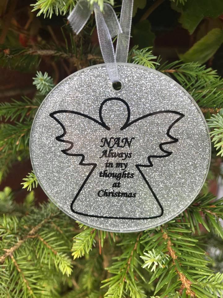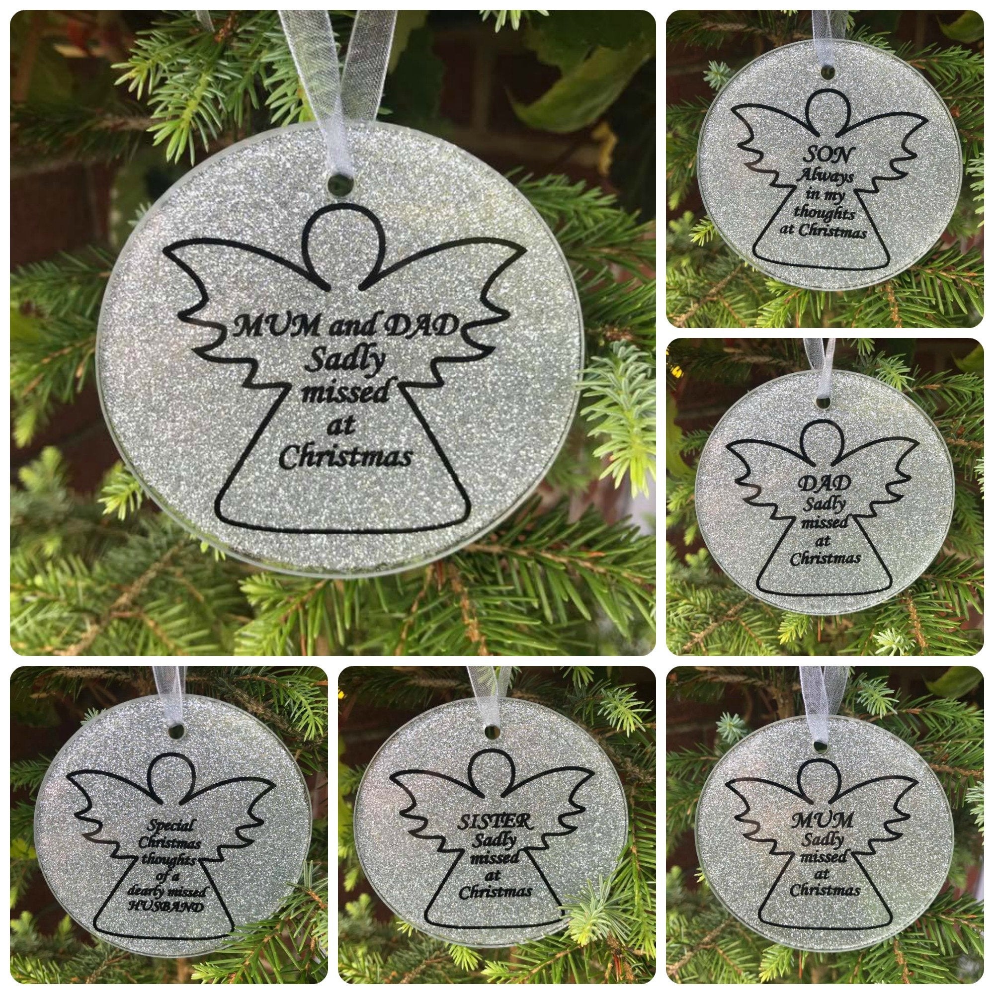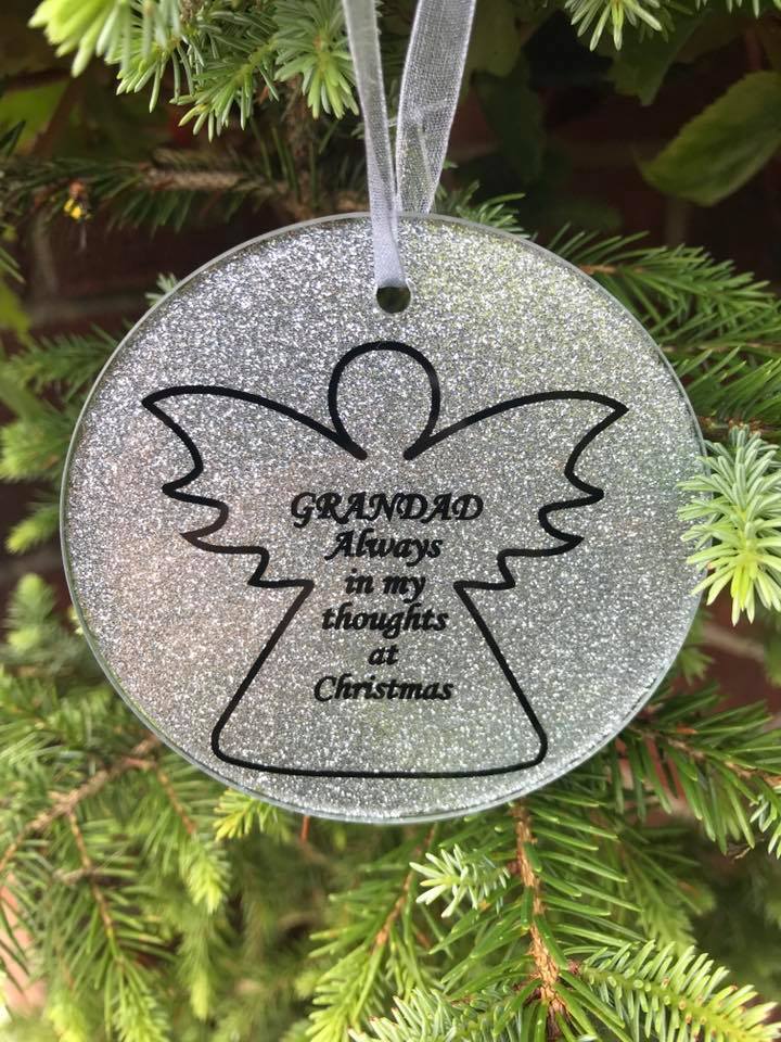 - A beautiful round glass Angel decoration and message to a lost loved one. The decoration comes with an organza ribbon making it ready to hang.