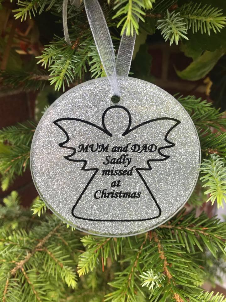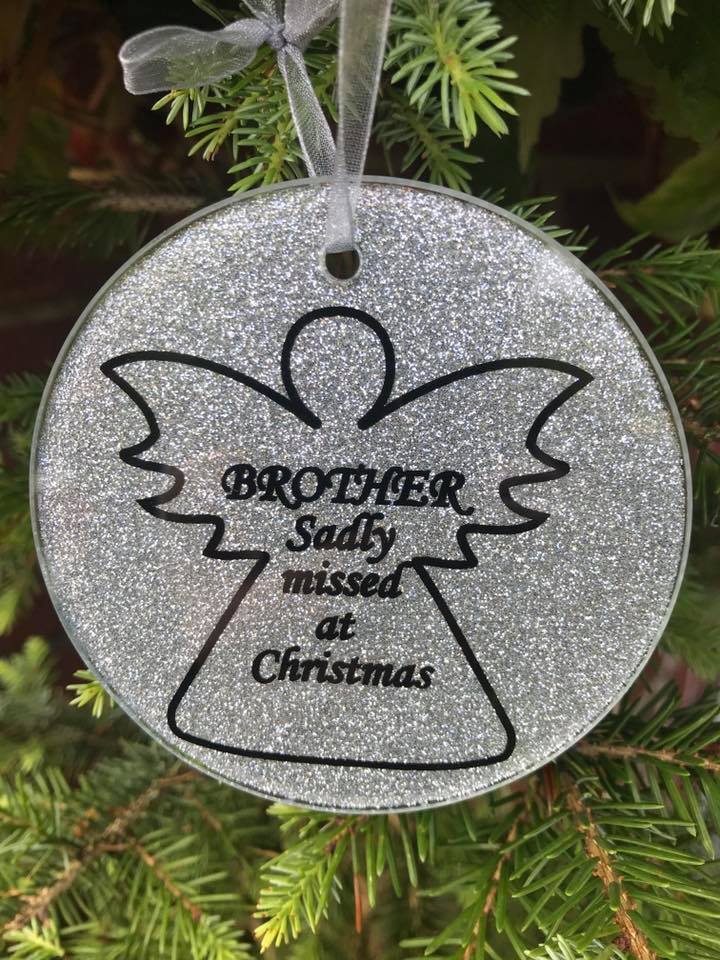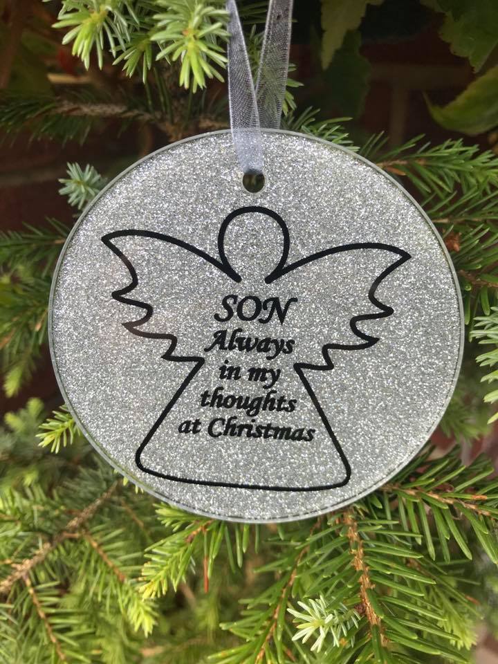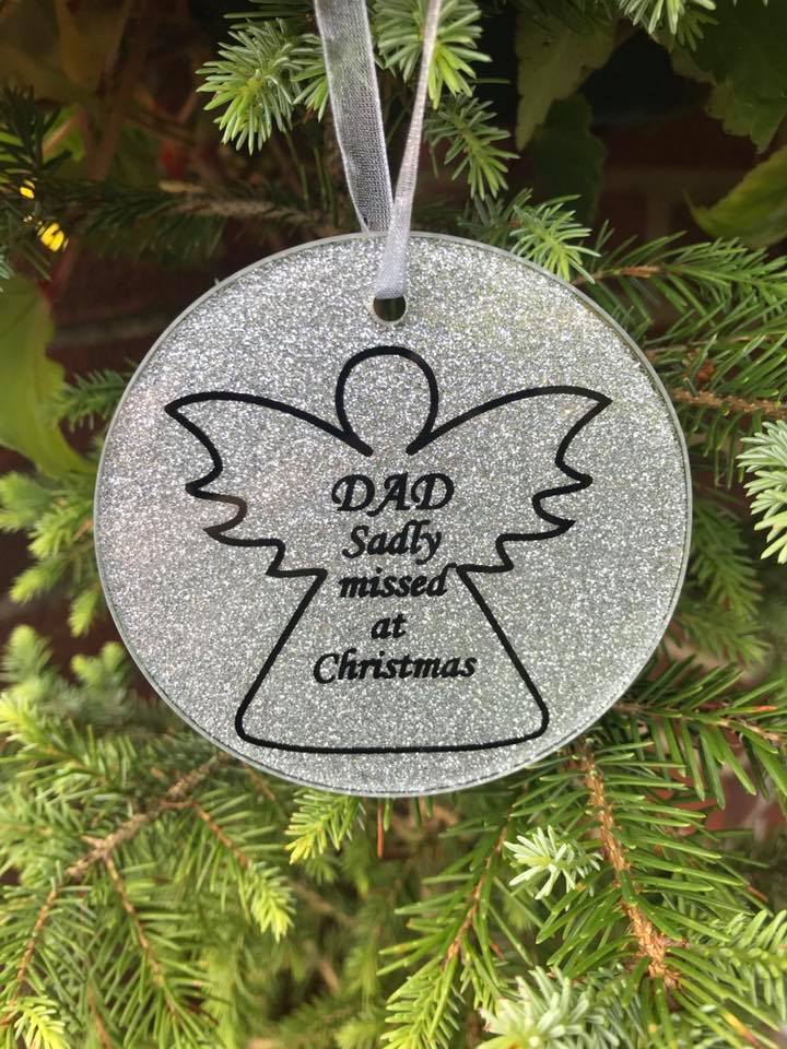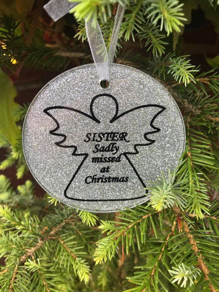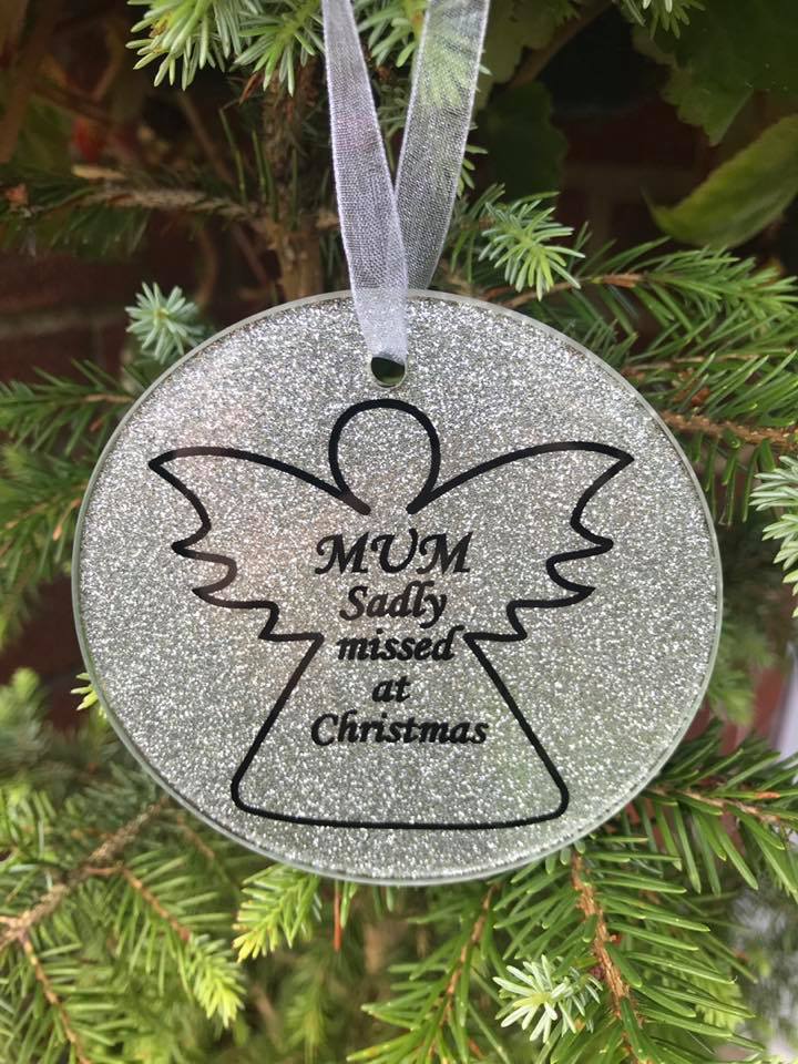 - A beautiful round glass Angel decoration and message to a lost loved one. The decoration comes with an organza ribbon making it ready to hang.
