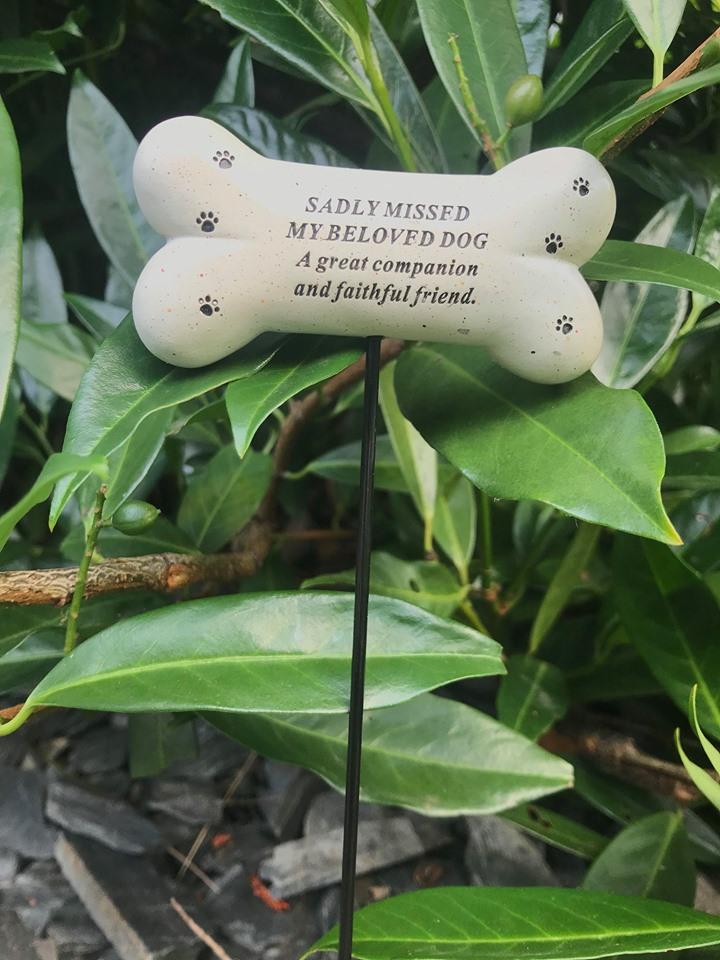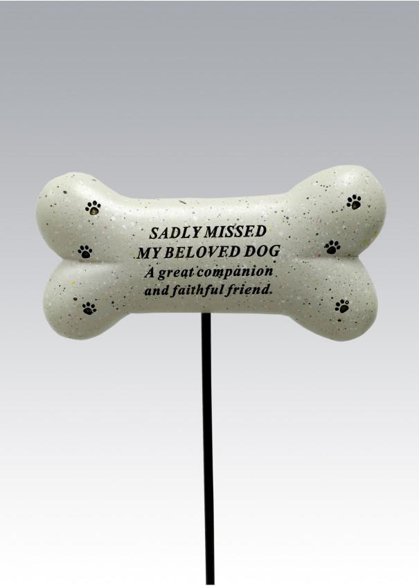 Sentimental Dog Bone memorial stick with the wording "Sadly missed my beloved Dog. A great companion and faithful friend."