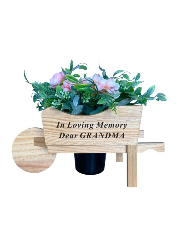 - A well made wooden memorial wheelbarrow with an empty plastic black insert for fresh / artificial flowers.